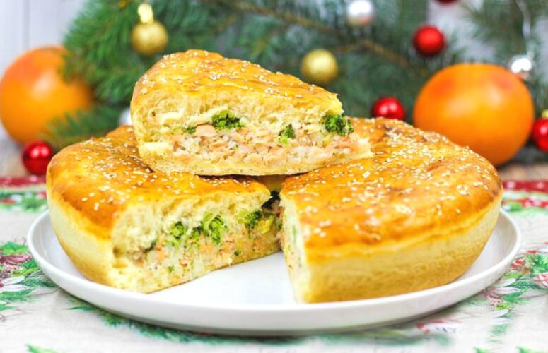 Праздничный пирог с красной рыбой и брокколи