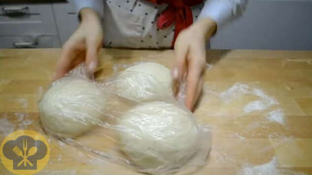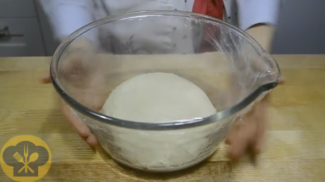 Замешиваем тесто до однородности минут 8-10, оно будет сильно липнуть к рукам, поэтому в конце замеса немного смажьте руки растительным маслом. Оставьте в тёплом месте на 1,5 часа, накрыв плёнкой.