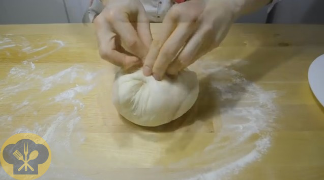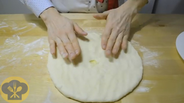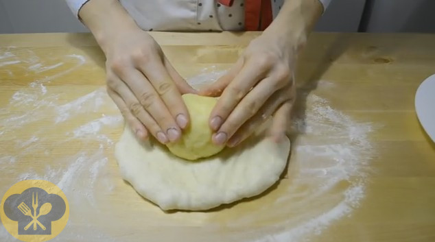 Затем (каждый) шарик из теста сплющите и руками из него слепите лепешку диаметром 26 см, на которую в центр выложите начинку.