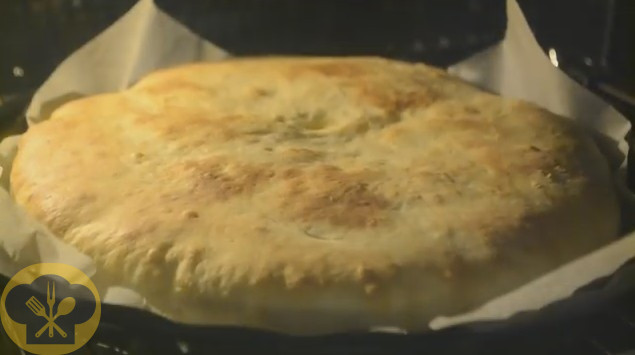 Как только осетинский пирог готов, он вышел ровный и одинаковый по толщине, переместите его на противень, который застелите пекарской бумагой и смажьте растительным маслом.