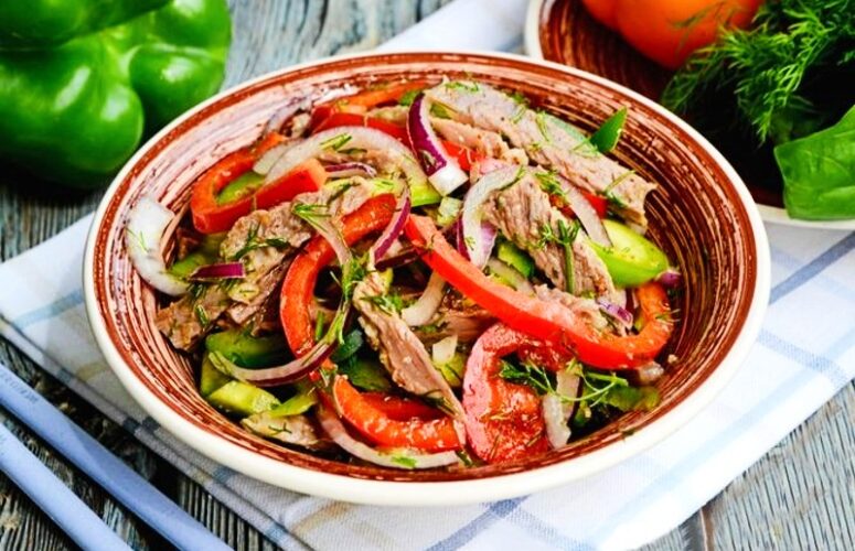Салат с говядиной, болгарским перцем, луком и орехами