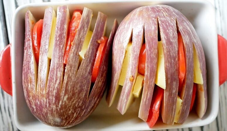 Запечённый веер из баклажанов ,томатов и сыра